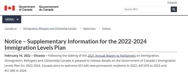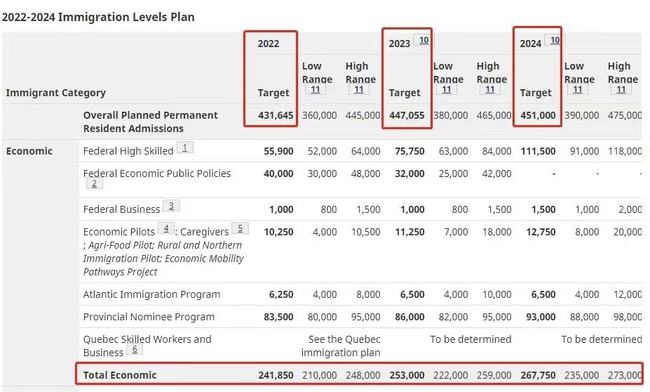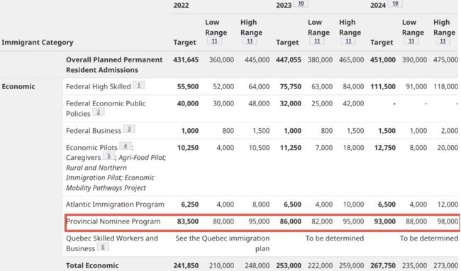 加拿大当地时间2月14日,移民部提交了《2022-2024年移民规模计划》,未来三年将接收超过120万名新移民,计划到2024年新增133万名永久移民。 今年的登陆目标为新增43.2万名永久居民,比原计划增加了20,645个名额。省提名类别增加了12,500个名额,家庭团聚移民的配额增加至105,000 个。 省通道是未来移民主要趋势 在IRCC公布的《2022年至2024年移民水平计划》中可以看到,IRCC 在2022年将接收431645名新移民,在2023年将接收447055名,在2024年将接收451000名。而每年的移民水平计划又分为经济类移民、家庭类移民、人道主义移民、难民这4项,其中经济类移民的占比最多。 在2022年,加拿大准备接收241850名经济类移民,在2023年接收253000名,在2024年将接收267750名。
